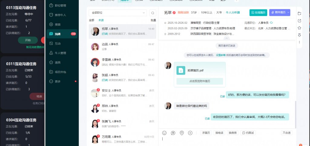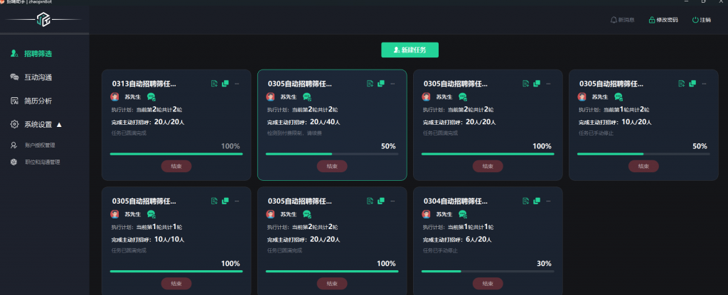 是一款基于LLM和Agent技术智能招聘系统,是君致泰公司内部服务中小企业招聘的利器,目前对外发布,通过该系统,HR招聘人员能够节约90%的时间完成招聘工作,大大提高招聘效率。目前具有自动打招呼,自动互动沟通、交换简历、交换微信以及形成企业自己的简历库等功能。