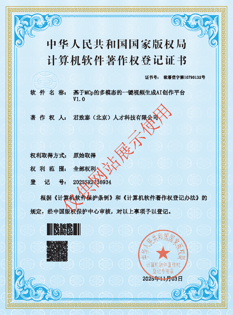 公司立足业务实践,创新打造拥有作品著作权的中小企业服务标准规范,将外包服务全流程标准化、体系化,保障服务质量稳定可控。同时聚焦 AI 与大模型技术,自主研发多款自主知识产权产品,形成覆盖人力资源全场景的智能工具矩阵:中小企业智能人力资源管理系统,实现人事、考勤、薪酬、绩效一体化高效管理;基于 MCP 多模态一键视频生成 AI 创作平台,快速产出招聘与品牌宣传内容;大语言模型招聘机器人,精准筛选、智能沟通,显著提升招聘效率与匹配度。